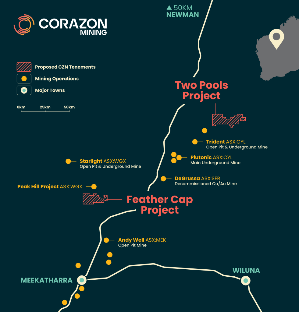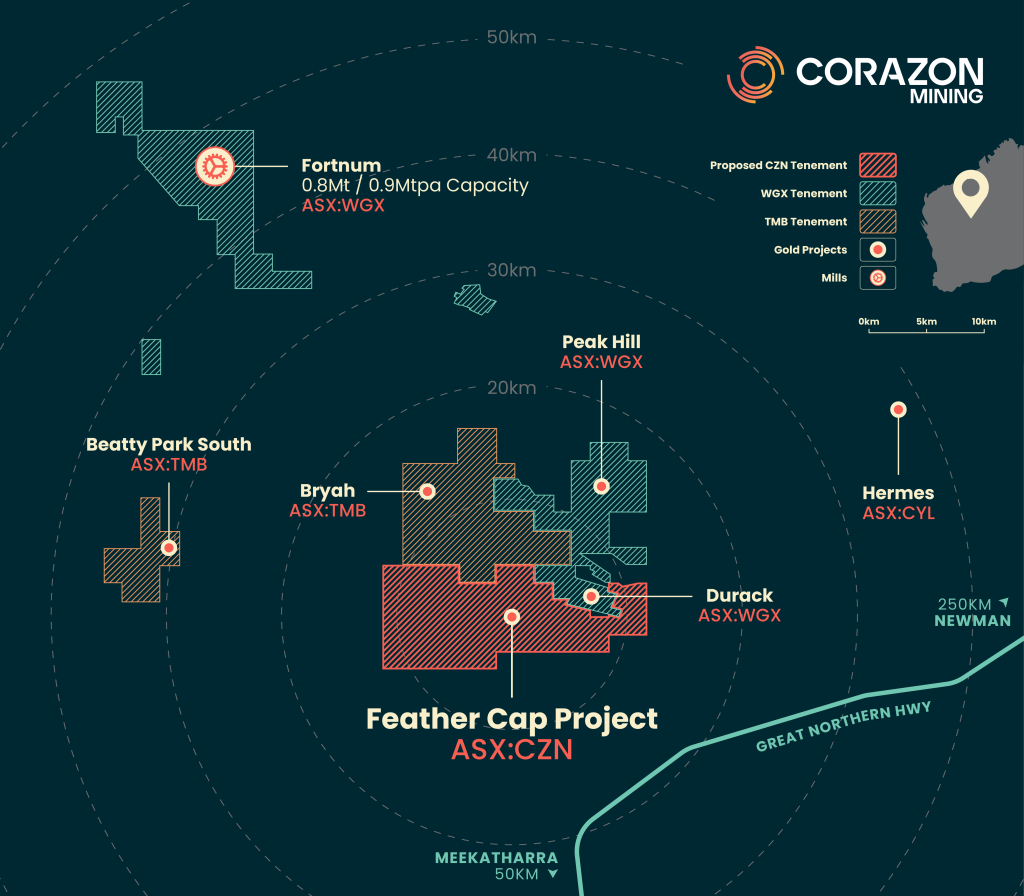 The Feather Cap gold Project is a high-potential asset located within the Bryah-Padbury Basin, part of the Capricorn Orogen in Western Australia. The Project is situated in a proven mineral province that hosts significant gold and base metal deposits and provides Corazon with a second major front for gold discovery.