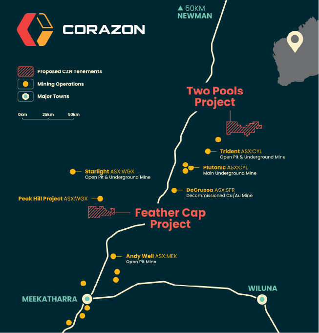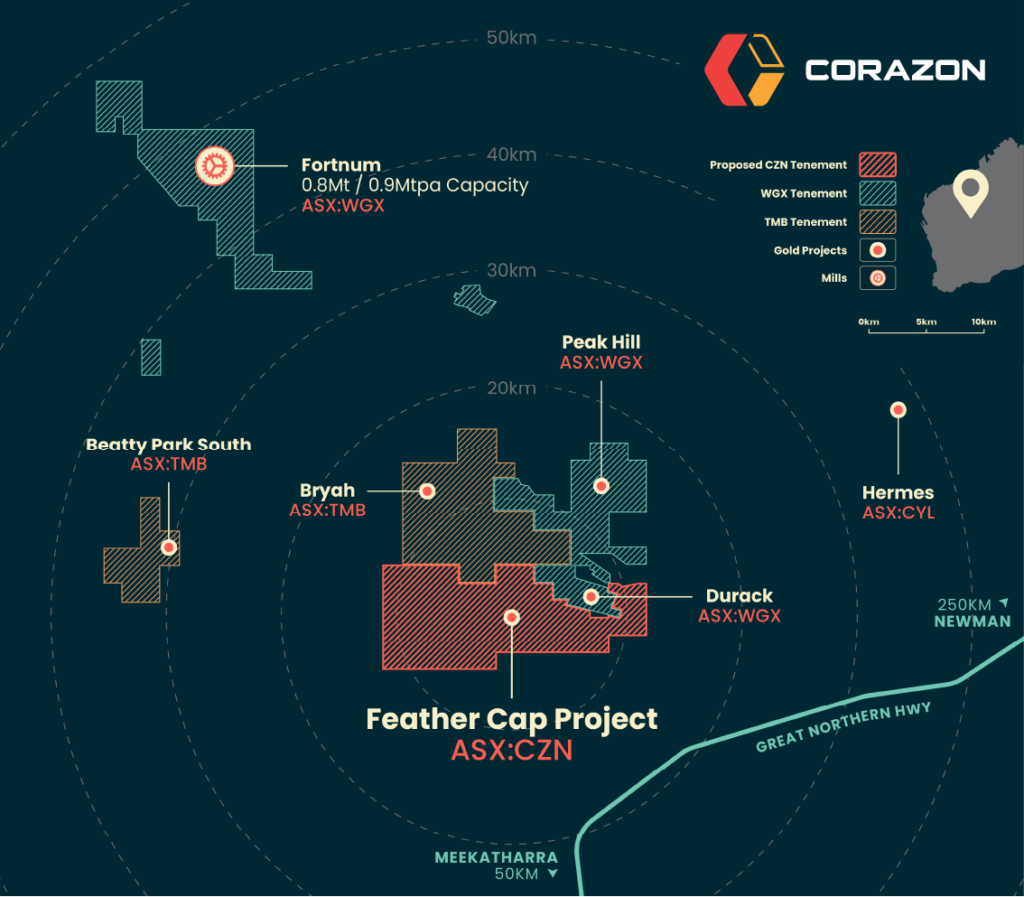 The Feather Cap gold Project is a high-potential asset located within the Bryah-Padbury Basin, part of the Capricorn Orogen in Western Australia. The Project is situated in a proven mineral province that hosts significant gold and base metal deposits and provides Corazon with a second major front for gold discovery.
